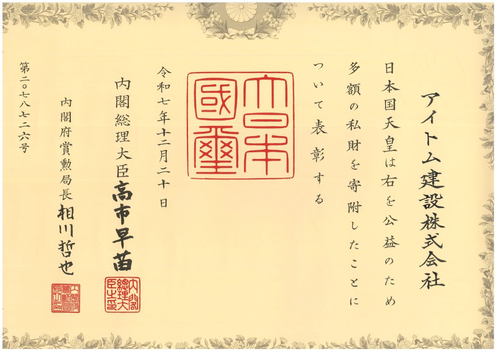 日本国天皇より紺綬褒章を授章いたしました。